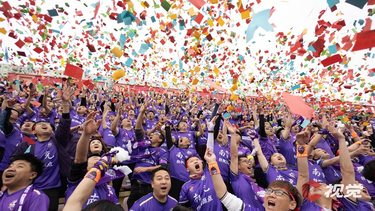 4月11日下午,“川超”决赛阶段第五轮比赛,南充丝绸源点队主场迎战达州川汉子队。最终南充队以3:1获得胜利。图为南充球迷在“纸片雨”中欢呼。C视觉签约摄影师 李钢 摄