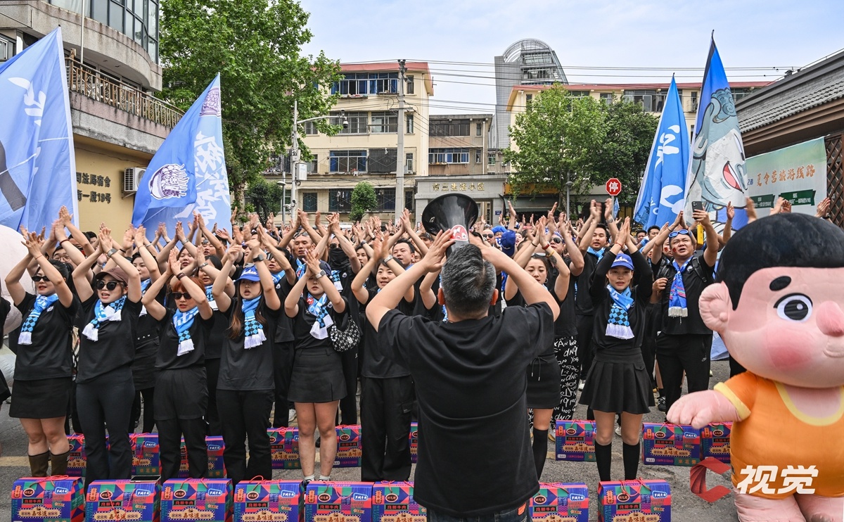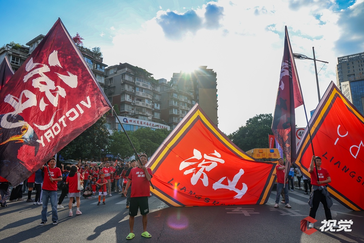 4月11日,“川超”决赛阶段第五轮比赛,宜宾长江首城队主场迎战凉山好医生队。赛前,凉山球迷在场外为球队加油助威。C视觉签约摄影师 张元戎 摄