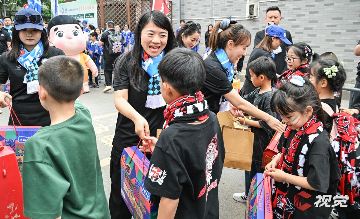 4月11日,“川超”决赛阶段第五轮比赛,德阳重装队主场迎战乐山味道非常队。开赛前,双方球迷互赠吉祥物。C视觉签约摄影师 王福明 摄