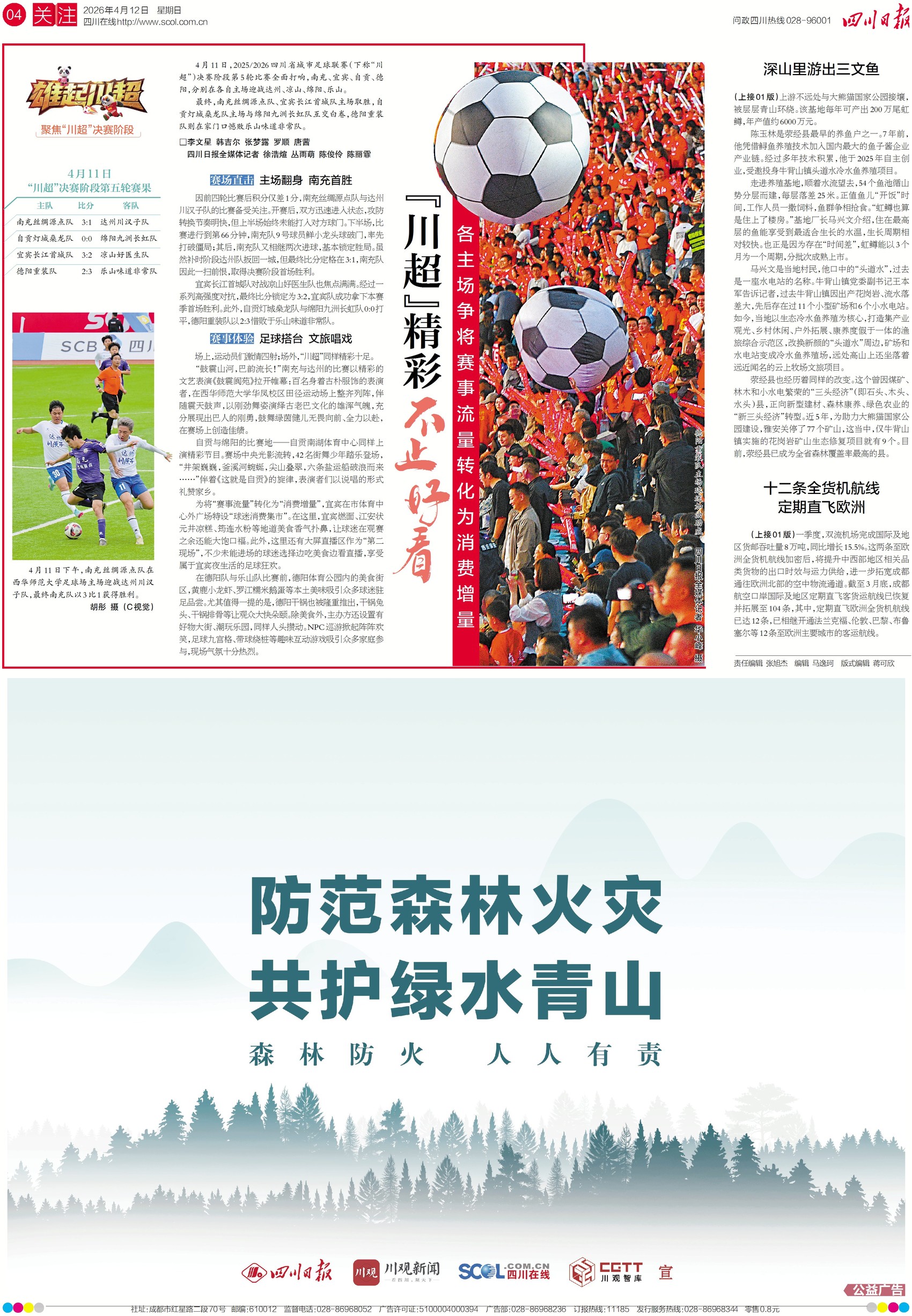 成都以外,“川超”精彩雄起——“川超”决赛阶段第五轮比赛分别在南充、宜宾、自贡、德阳4地打响。 比赛中,8支队伍的运动员们激情四射;比赛之外,各类文艺表演、文旅活动同样精彩十足,充分将“赛事流量”转化为“消费增量”。 今日二版、四版,为您呈现的不仅是赛场上燃情,更有赛事带来的科学激情、文化盛宴、消费狂欢。