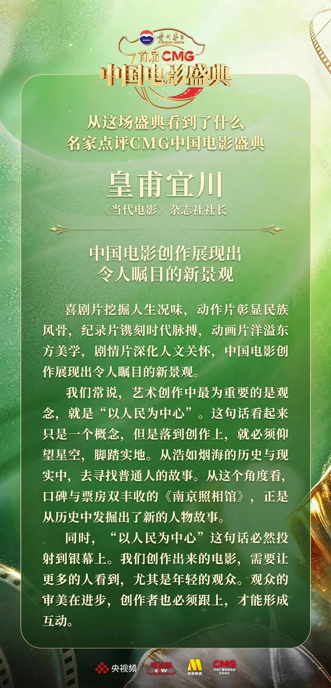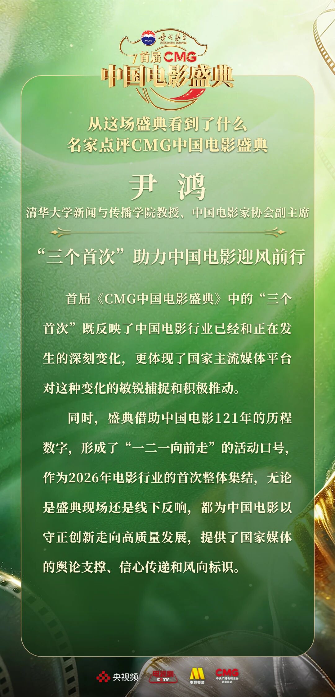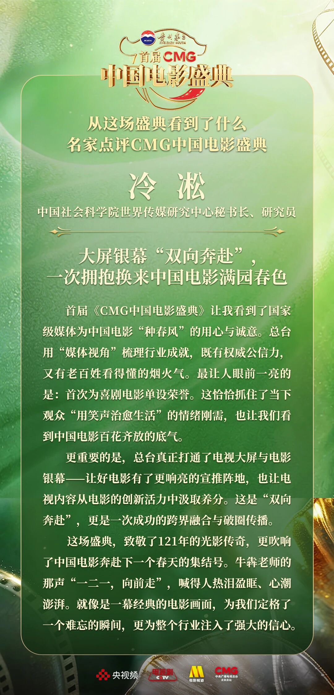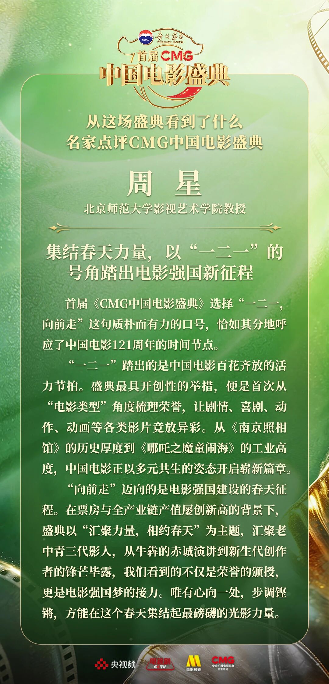 一二一向前走!以电影之名汇聚力量,相约春天!4月10日,由中央广播电视总台视听新媒体中心、影视剧纪录片中心、电影频道节目中心、北京总站共同推出的首届《CMG中国电影盛典》踏春而来,如期绽放。这场献给所有热爱电影之人的春日之约,聚焦“电影+”生态,首次从“电影类型”角度梳理、观察、致敬中国电影。一项项沉甸甸的荣誉,让每一位电影人的热爱都被看见、被铭记。中国电影百花齐放的蓬勃生机,也激荡起众多专家学者由衷的热议与回响。