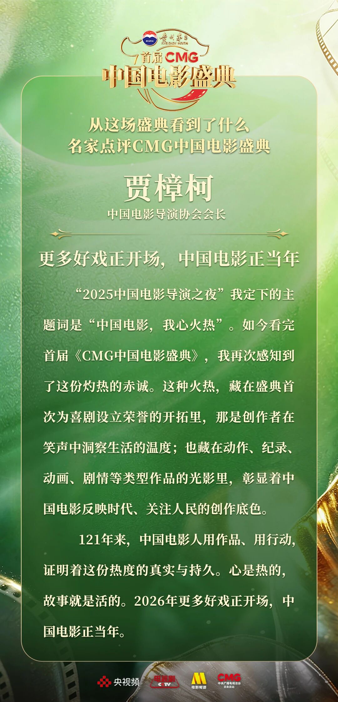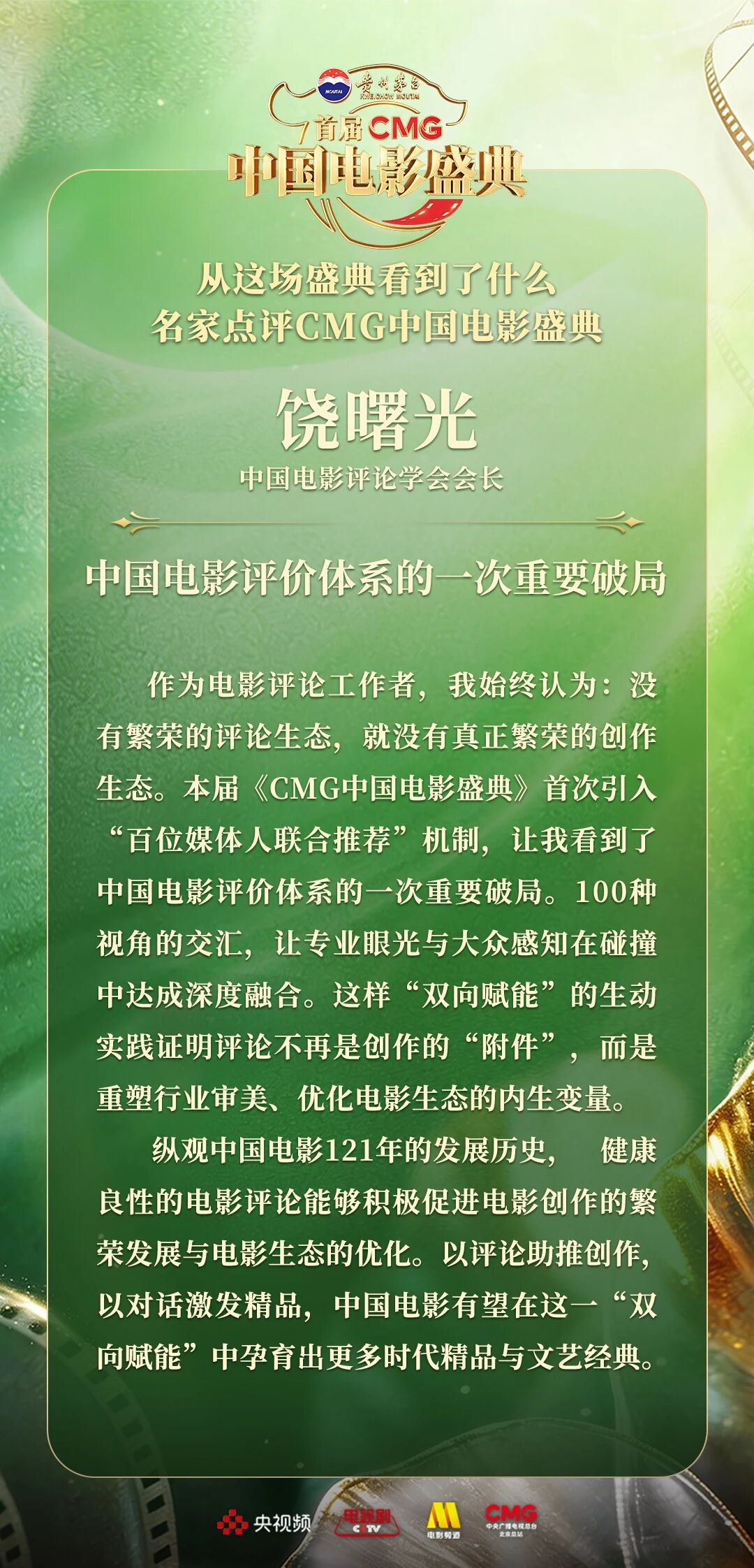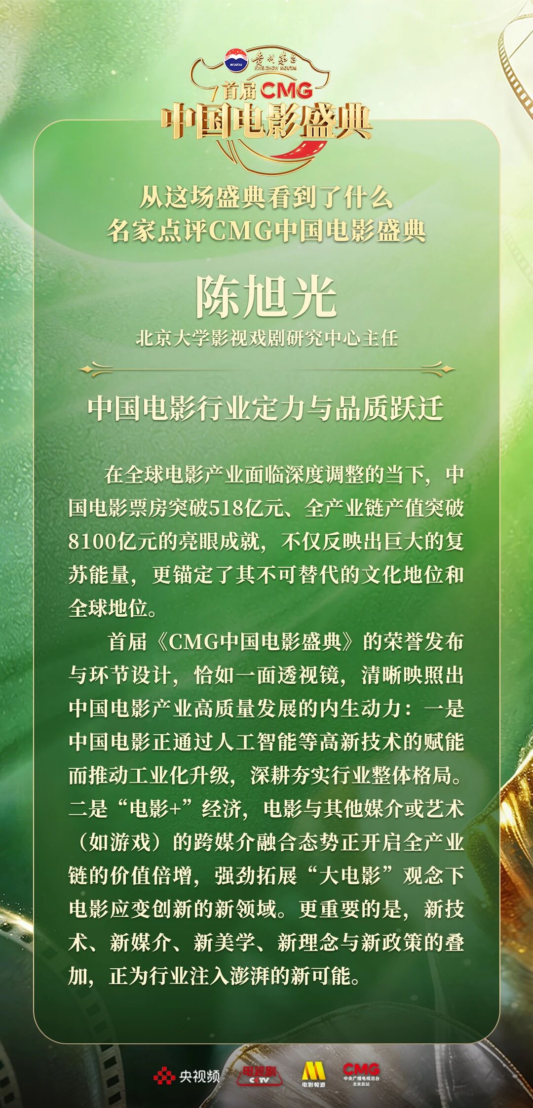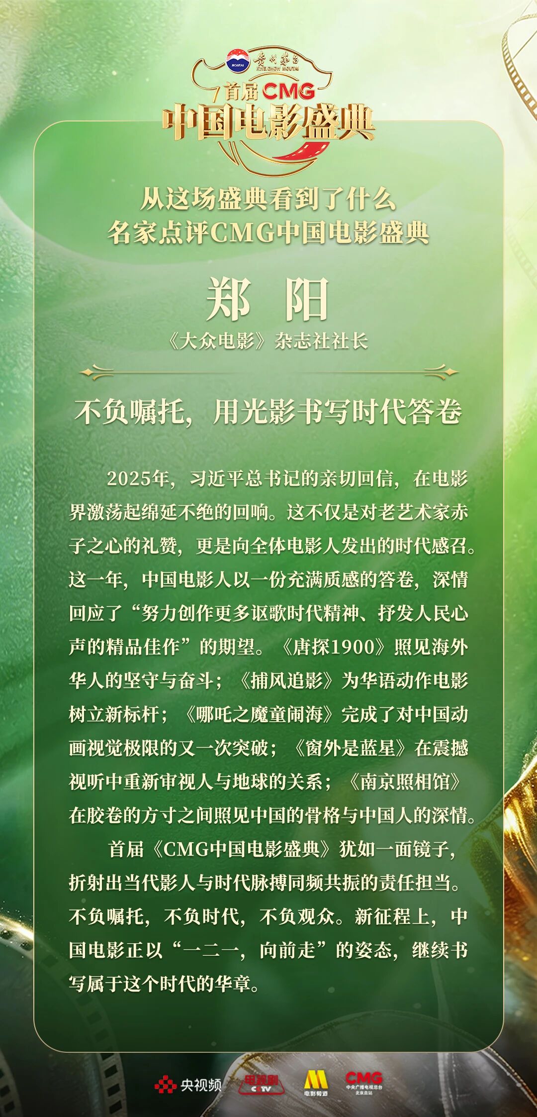 一二一向前走!以电影之名汇聚力量,相约春天!4月10日,由中央广播电视总台视听新媒体中心、影视剧纪录片中心、电影频道节目中心、北京总站共同推出的首届《CMG中国电影盛典》踏春而来,如期绽放。这场献给所有热爱电影之人的春日之约,聚焦“电影+”生态,首次从“电影类型”角度梳理、观察、致敬中国电影。一项项沉甸甸的荣誉,让每一位电影人的热爱都被看见、被铭记。中国电影百花齐放的蓬勃生机,也激荡起众多专家学者由衷的热议与回响。