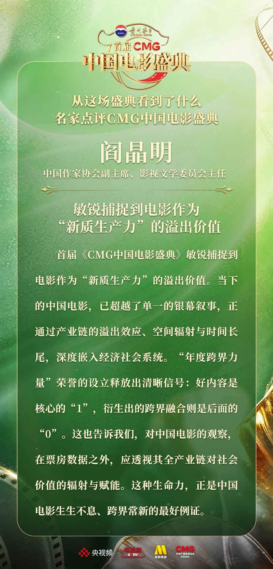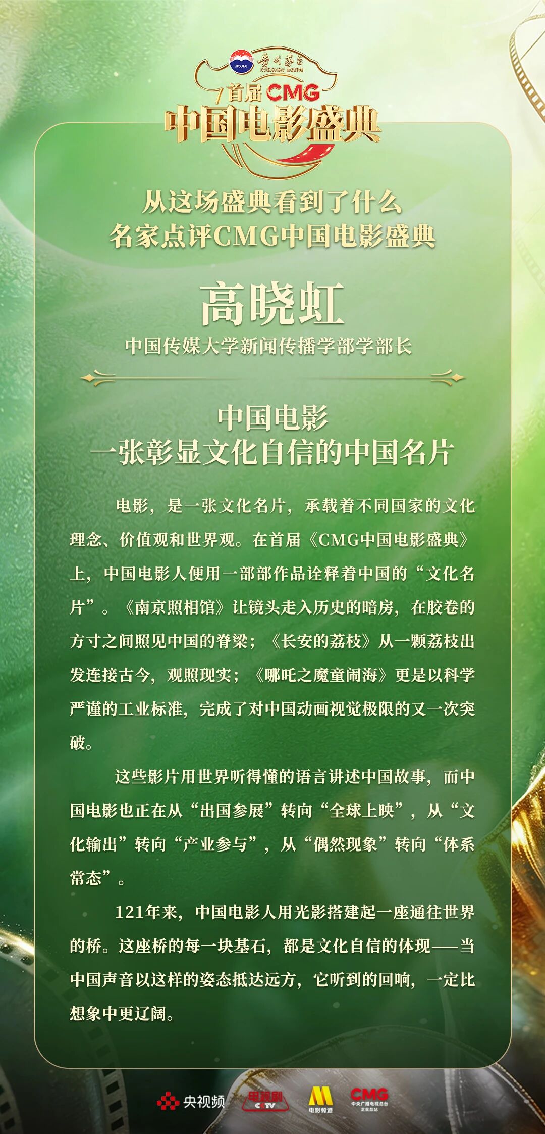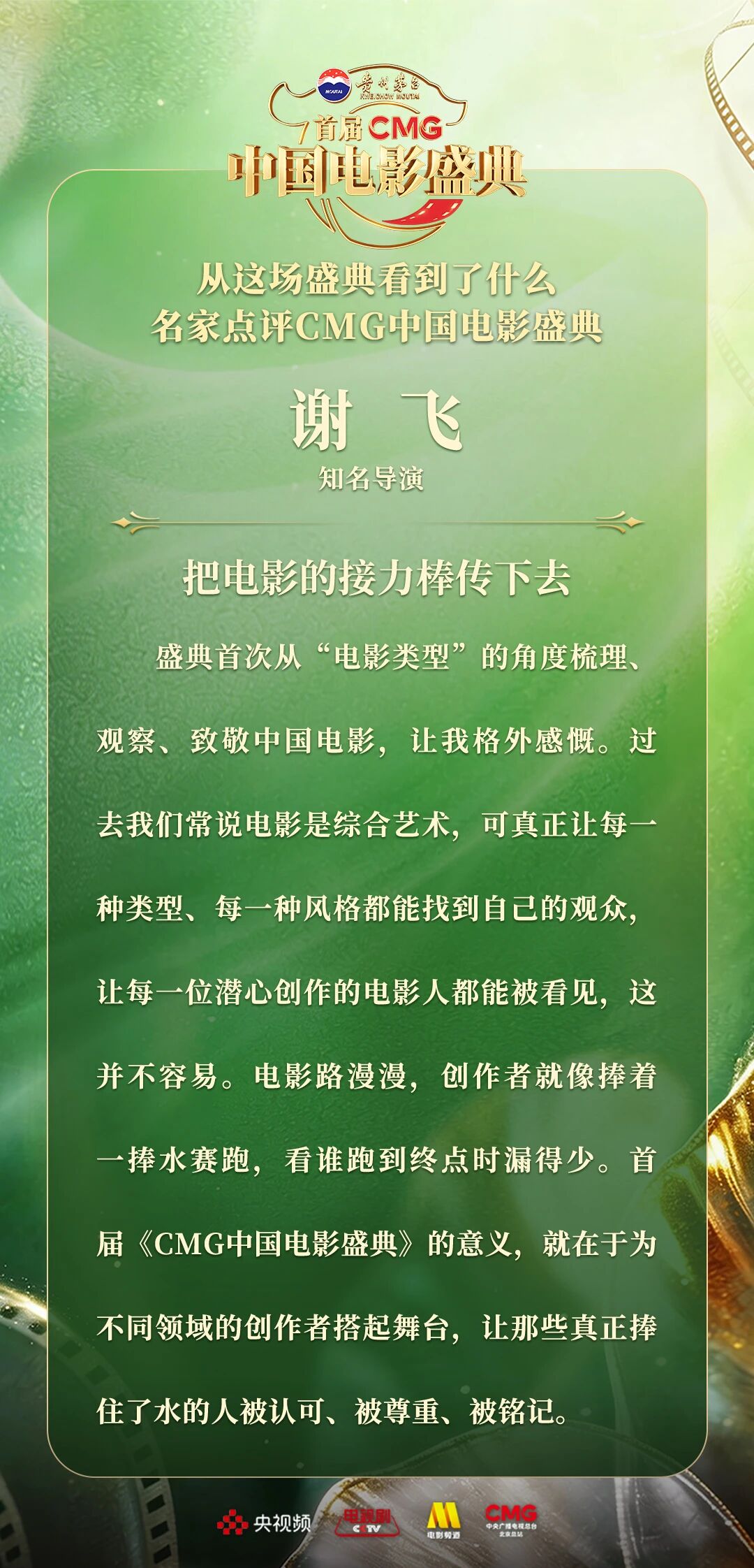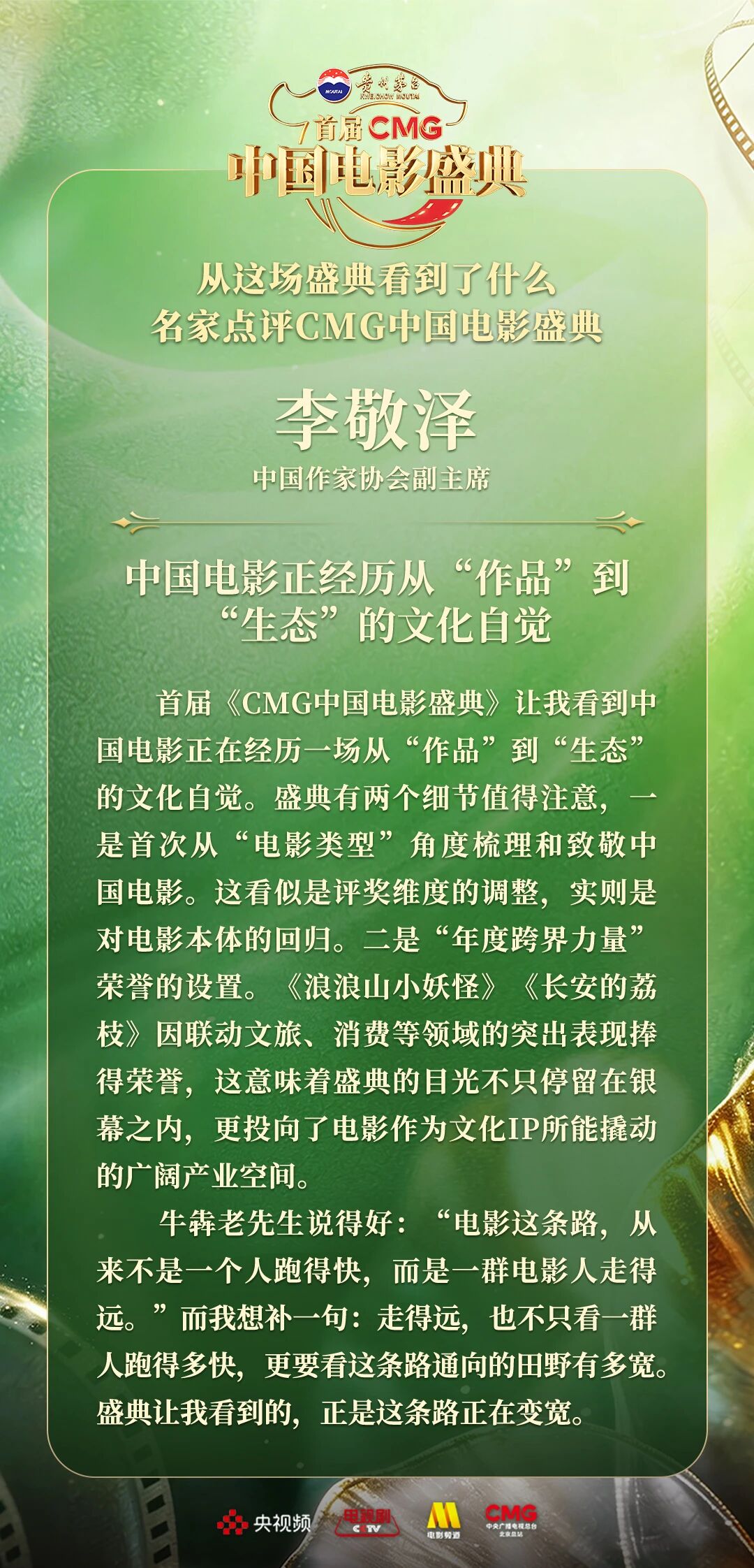 一二一向前走!以电影之名汇聚力量,相约春天!4月10日,由中央广播电视总台视听新媒体中心、影视剧纪录片中心、电影频道节目中心、北京总站共同推出的首届《CMG中国电影盛典》踏春而来,如期绽放。这场献给所有热爱电影之人的春日之约,聚焦“电影+”生态,首次从“电影类型”角度梳理、观察、致敬中国电影。一项项沉甸甸的荣誉,让每一位电影人的热爱都被看见、被铭记。中国电影百花齐放的蓬勃生机,也激荡起众多专家学者由衷的热议与回响。