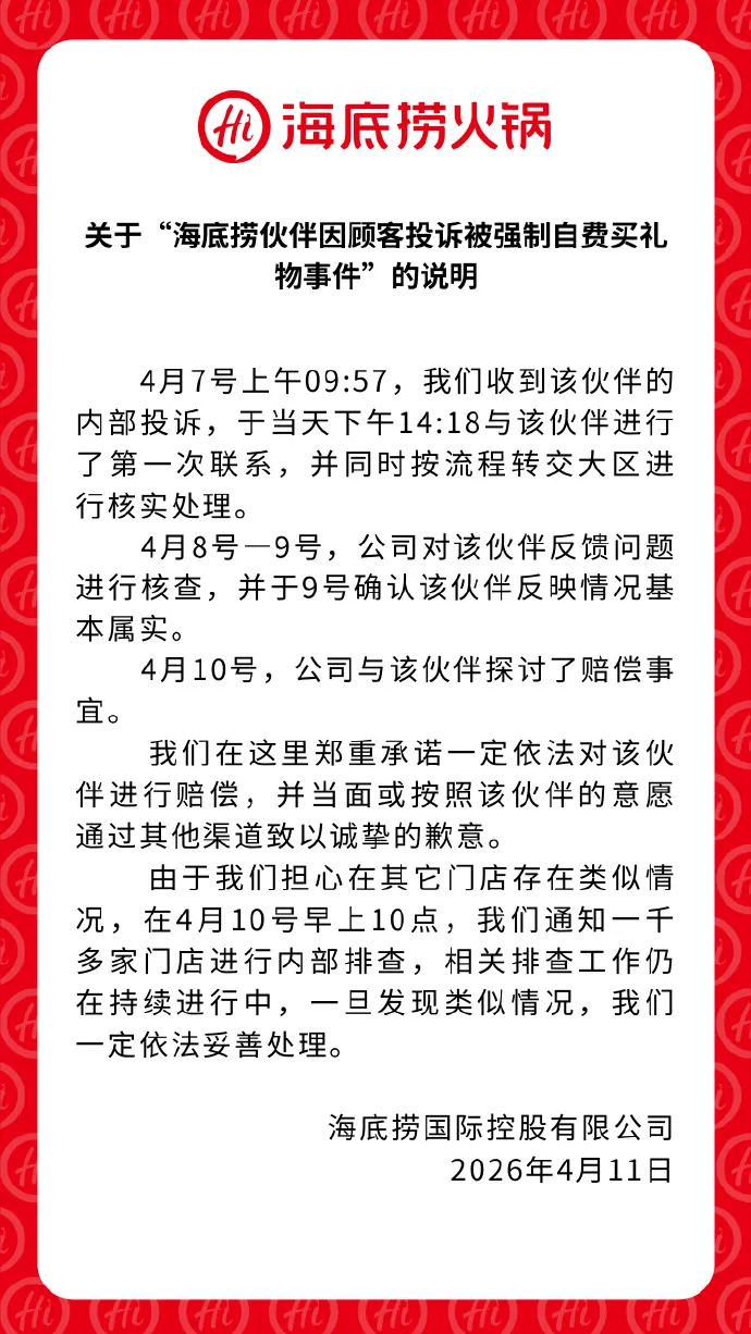 4月11日,@海底捞火锅 发布关于“海底捞伙伴因顾客投诉被强制自费买礼物事件”的说明: