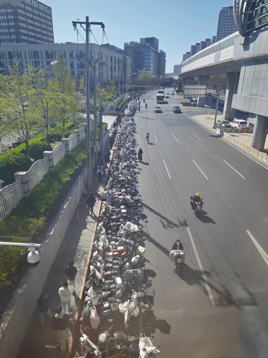 4月7日早高峰时段,北京日报记者在立水桥南站C口看到,从地铁口向南北延伸、长约二百米的非机动车道被各类非机动车塞得水泄不通。非机动车道里侧,一排排私人电动自行车和自行车垂直路沿停了一整排;一辆挨一辆实在放不下,又斜着往外摆出第二排;最终连第二排也挤不下,车头、车尾便探进了机动车道。