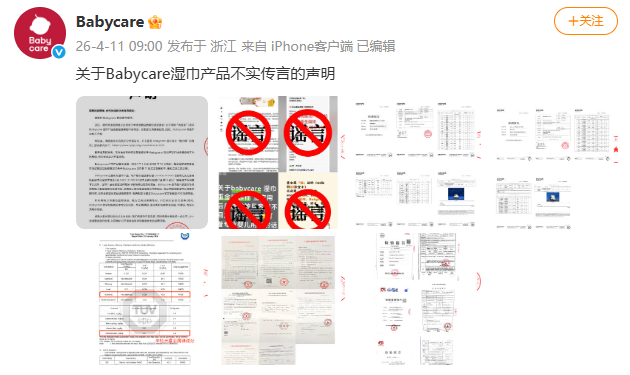 4月11日,Babycare发布声明和相关检测报告,否认湿巾产品存在“检出锑”的情况。