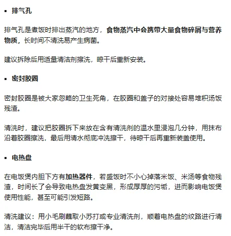 为了保证食品安全,吃不完的米饭应在2个小时内放入冰箱冷藏;电饭煲保温不要超过4个小时;在食用剩米饭时必须彻底加热。此外,日常使用电饭煲后,应及时清洁,尤其要注意排气孔、密封胶圈等部位。