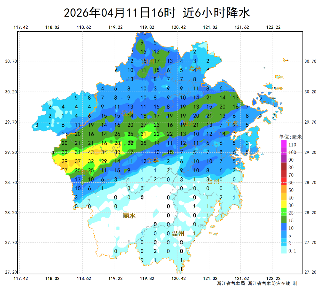 昨天白天的雨区逐渐朝北转移,到了下午,降水范围基本集中在浙中和浙北一带,局地雨势很大。截至下午16时,近6小时降水最大出现在开化县的杨村站点,50.8毫米,达到了暴雨量级。