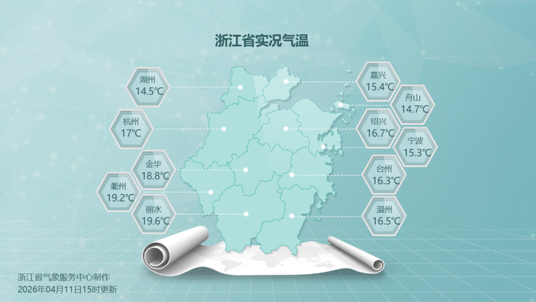 雨水影响下,昨天的气温“乖巧可人”,下午15时,各地气温均在20℃以下,湖州甚至在15℃以下,温凉舒适。和前天同一时刻相比较,多地降幅10℃以上,最夸张的是温州永嘉,降幅16.3℃,堪比换季式降温!