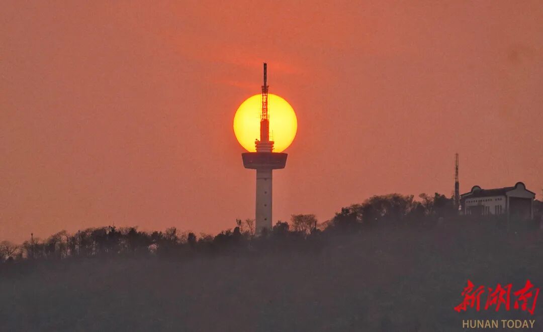 火红的夕阳与长沙岳麓山“长沙之眼”的轮廓相互映衬。 湖南日报全媒体记者 徐行 摄
