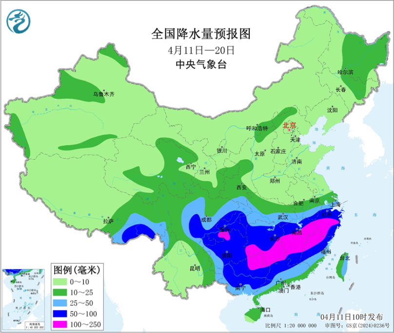 中央气象台预计,未来10天(4月11-20日),江南、华南北部以及重庆、贵州等地累计降水量有50~90毫米,部分地区有100~130毫米;西藏东部及四川大部等地累计降水量有20~30毫米,局地50毫米以上;东北地区中北部、华北北部、青海中东部等地累计降水量有10~20毫米;上述大部地区降水量较常年同期偏多3~7成,部分地区偏多1倍以上。