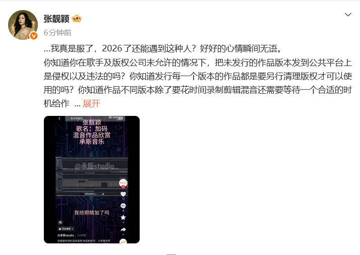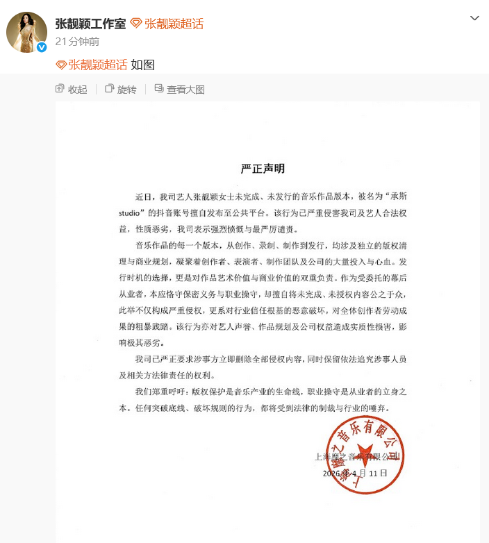 随后,张靓颖工作室发布严正声明,称账号“承斯studio”擅自发布艺人张靓颖未完成、未发行的音乐作品版本至公共平台,该行为已严重侵害我司及艺人合法权益,性质恶劣,并表示强烈愤慨与最严厉谴责。张靓颖工作室称,已严正要求涉事方立即删除全部侵权内容,同时保留依法追究涉事人员及相关方法律责任的权利。