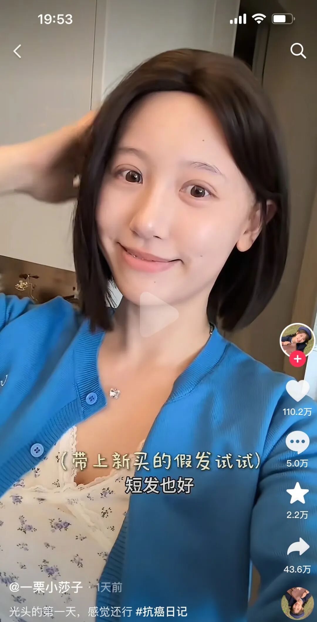 4月10日,千万粉丝网红“一栗小莎子”发视频分享自己剃光头的过程,并配文“光头的第一天感觉还行”,记录下自己对抗癌症化疗的重要一步。