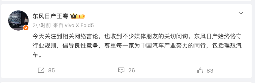 李想发文不久后,东风日产汽车销售有限公司新能源品牌总经理王骞通过官方认证账号发文称,“今天关注到相关网络言论,也收到不少媒体朋友的关切问询。东风日产始终恪守行业规则,倡导良性竞争,尊重每一家为中国汽车产业努力的同行,包括理想汽车。”