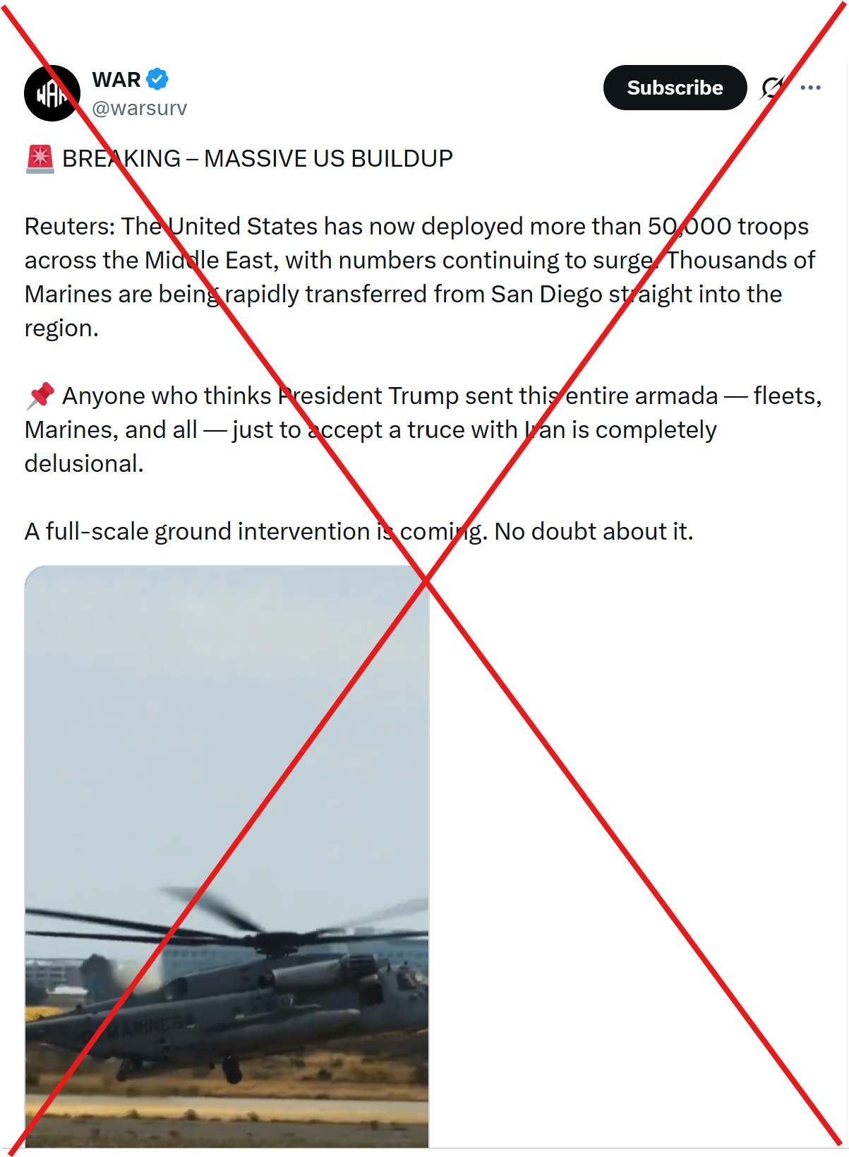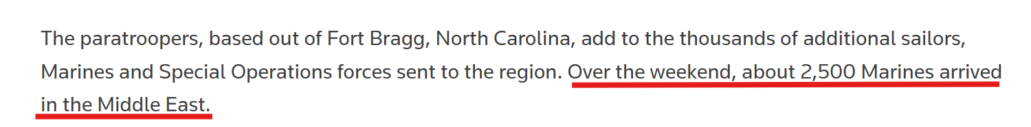 另有社交媒体用户在视频配文中写道:“据路透社报道,美国目前已在中东地区部署超过5万兵力,且人数仍在持续激增。数千名海军陆战队员正从圣迭戈火速调往该地区 。”视频还配上评论称,“若有人认为美国派出海军和海军陆战队,仅仅是为了与伊朗达成停火协议,那简直是痴人说梦。 一场全面地面军事干预即将来临。毋庸置疑。”
