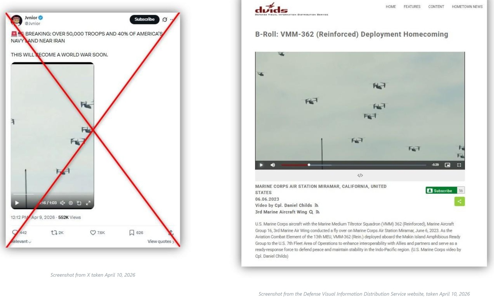 媒体通过反向图片搜索,在美国国防部下属网站“防御视觉信息分发服务”(DVIDS)找到了2023年6月6日发布的文章,其中视频内容与热传视频完全一致。据描述,当时美国海军陆战队第362中型倾转旋翼机中队在加州米拉马航空站进行了飞行表演。