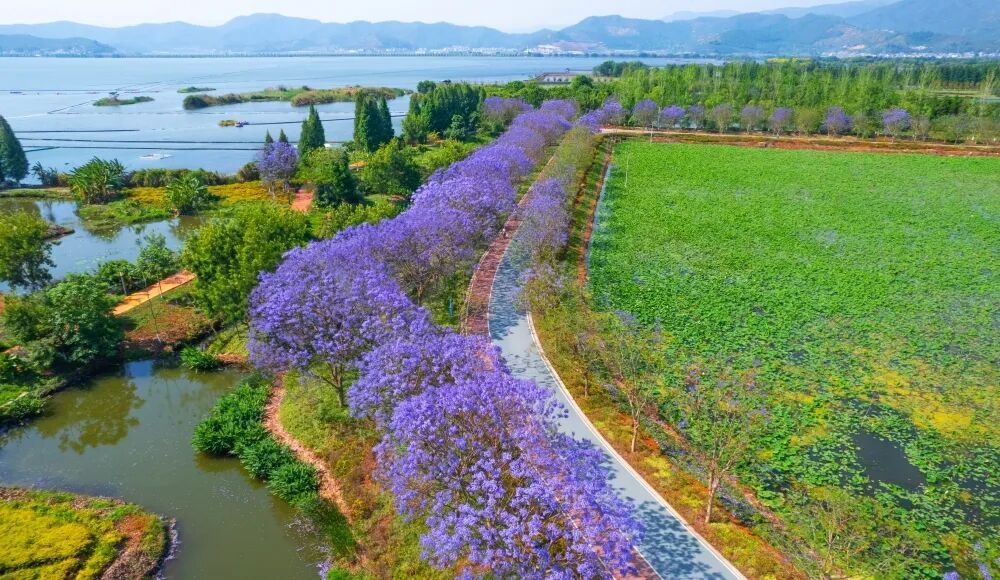 四月的红河哈尼族彝族自治州石屏县异龙湖畔,蓝花楹悄然盛放。环湖赛道被染上一层梦幻的蓝紫色,一串串风铃般的花朵挂满枝头,在微风中轻轻摇曳。市民骑行或漫步于花下,与盛放的蓝花楹、静谧的湖畔相映,构成一幅绝美的春日画卷。