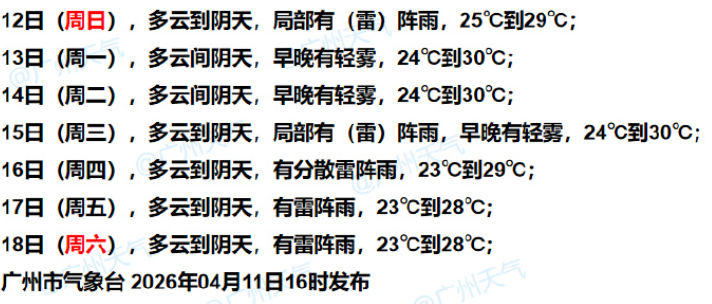4月12日—13日,韶关、清远、肇庆北部市县多云到阴天,有(雷)阵雨,局部有大雨或8级左右雷雨大风,雷州半岛晴到多云,其余市县多云间阴天,局部有(雷)阵雨,部分市县早晚有轻雾。白天最高气温:肇庆、云浮、茂名、湛江32~34℃(雷州半岛35~38℃),其余大部分市县29~32℃。