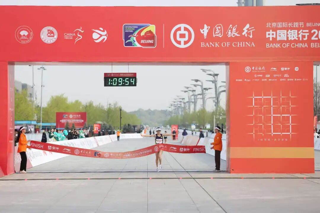 女子组,许双双以1小时09分55秒赢得冠军。继上个月以1小时09分34秒的个人最好成绩第四次获得上海半马国内女子冠军后,她首次赢得北京半马冠军。