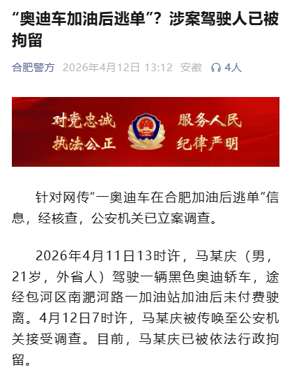 据合肥警方微信公众号4月12日消息,针对网传“一奥迪车在合肥加油后逃单”信息,经核查,公安机关已立案调查。
