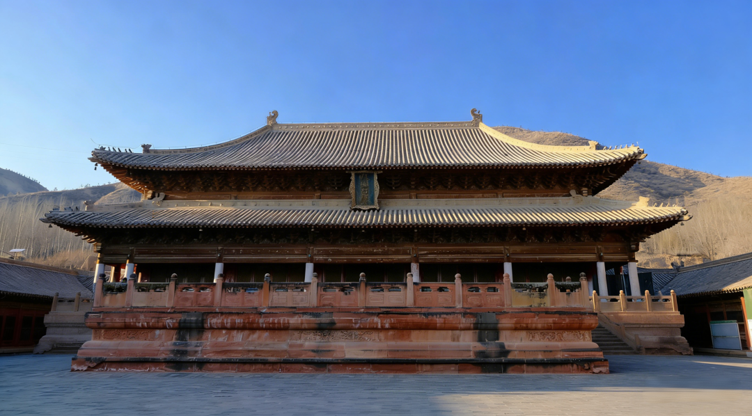 最令人惊叹的是两侧的“抄手斜廊”。这两条长各25米的廊道,以23度斜角缓缓升起,连接着主体建筑与东西配殿。在故宫,同样的斜廊已于康熙三十四年(1695年)拆除,而这里,明代工匠用榫卯和梁架,将时间凝固在了宣德二年。