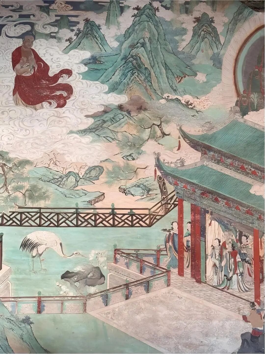 瞿昙寺最动人的,不是它像故宫,而是它如何在“像”中生长出自己的生命。壁画是最好的见证——在72间回廊的墙壁上,画师用矿物颜料绘制的超过360平方米的佛传故事。画面里,释迦牟尼的相貌带着汉地人物的清秀,衣纹却是藏式佛像的流畅线条;背景的山水用石青、石绿渲染,明显继承了宋代青绿山水的传统,但云气的画法又透出藏地唐卡的神韵。这种融合不是简单的拼接,而是深层的融合。