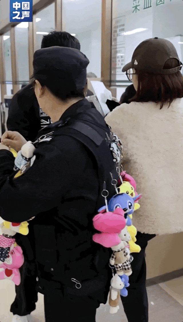 这时,一位身穿特殊制服的保安阿姨走了过来。她深蓝色工作服上,密密麻麻别满了小熊、小兔子等软萌玩偶,还有各色小汽车模型,前后加起来足足有三十多个,像一件可爱的“玩具披风”。
