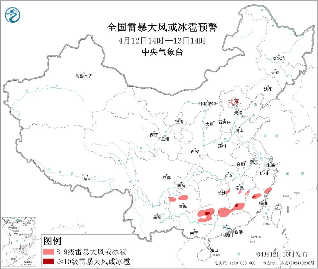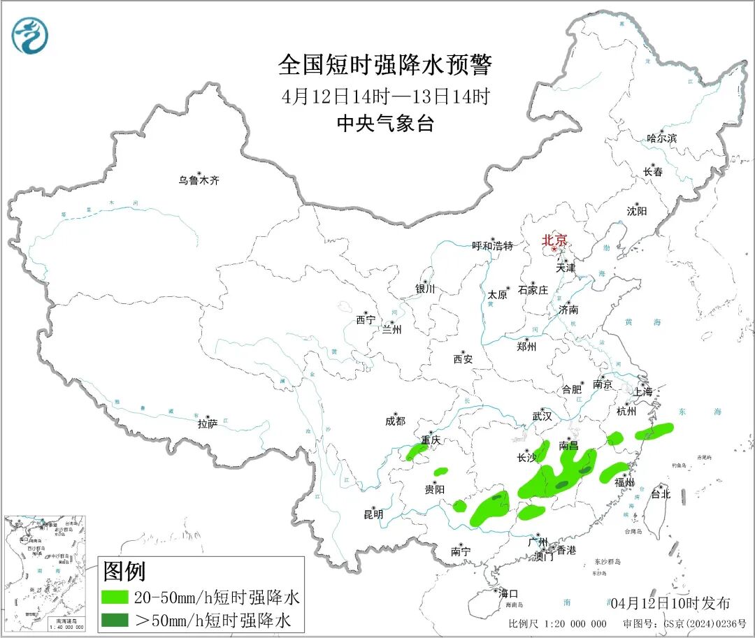 中央气象台4月12日10时继续发布强对流天气蓝色预警:预计4月12日14时至13日14时,江南中南部和东部、华南北部、西南地区东部等地的部分地区将有8级以上雷暴大风或冰雹天气,其中,江西南部、福建中北部、广西北部等地部分地区将有10级以上雷暴大风,最大风力可达11级以上;江南中南部和东部、华南北部、西南地区等地的部分地区将有小时雨量大于20毫米的短时强降水天气,其中,江西南部、广西北部等地的部分地区小时雨量大于50毫米。
