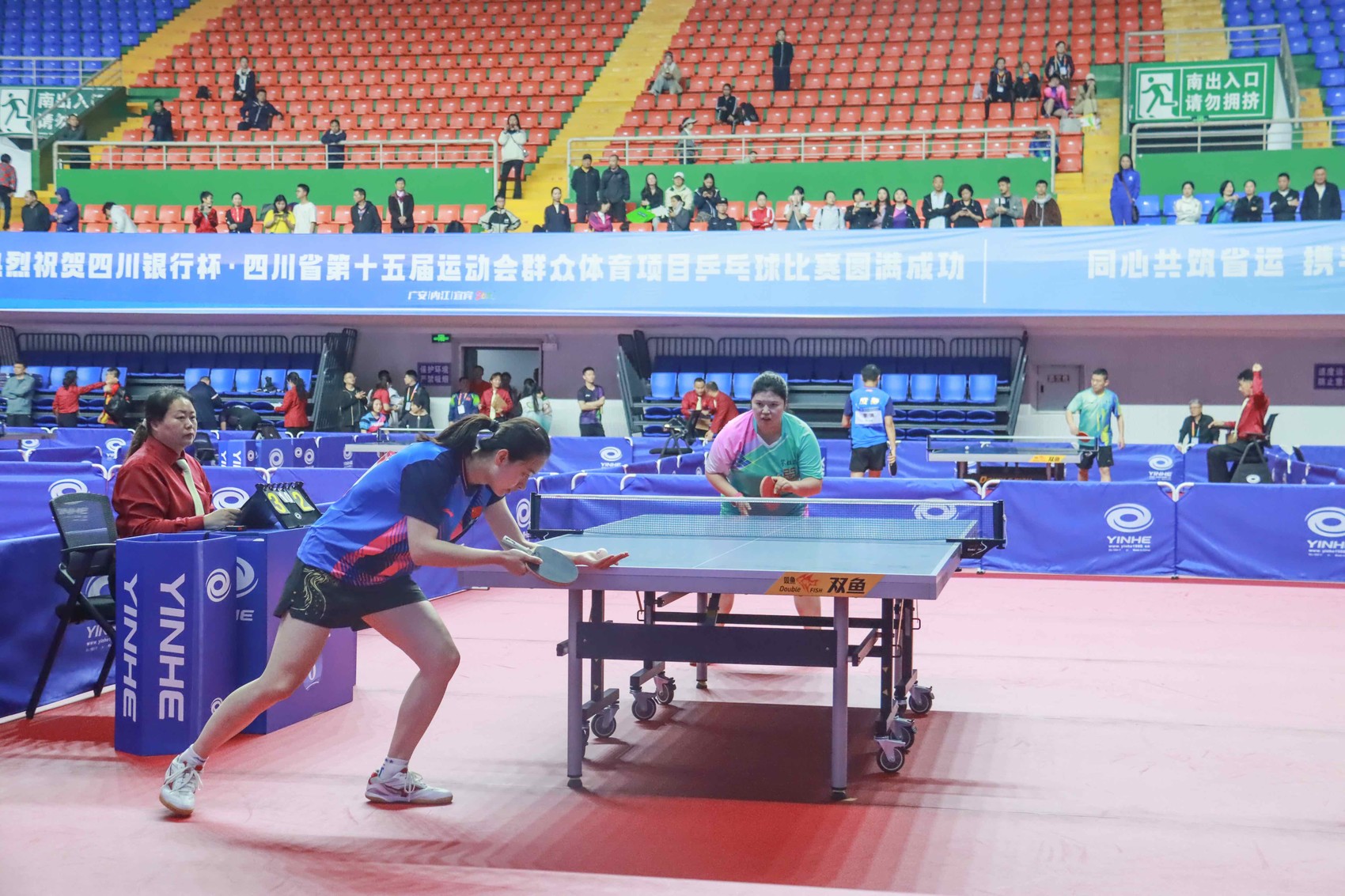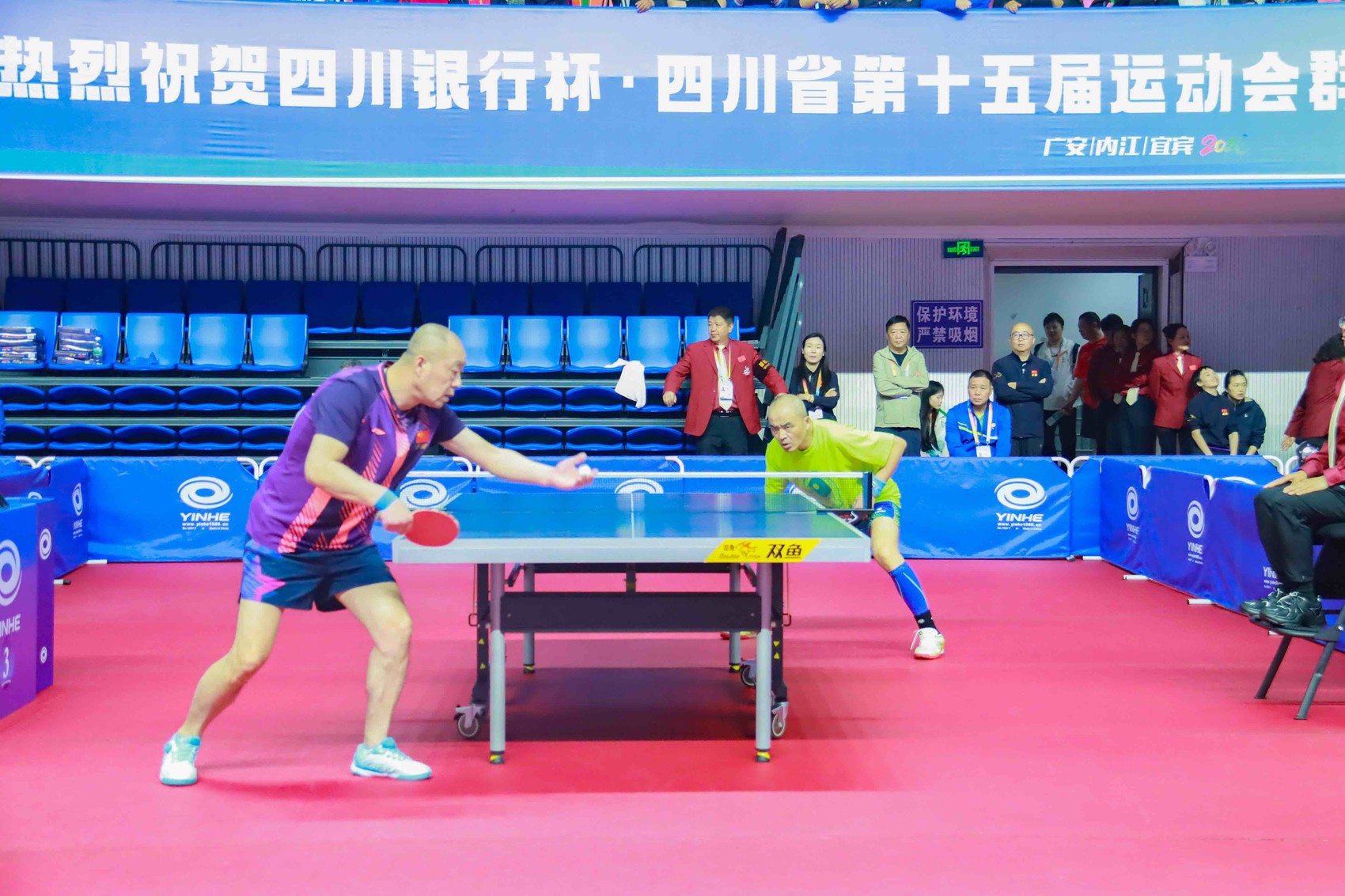 “好球!”“好球!”清脆的击球声此起彼伏,乒乓球在球桌上空飞速穿梭、往来交织。选手们身姿灵活,步伐敏捷,挥拍、发球、搓球、扣杀,每一个动作都干脆利落,尽显业余选手的专业训练素养。4月12日,四川省第十五届运动会群众体育项目乒乓球比赛在广安体育馆迎来了单打比赛日。这个比赛日产生了男、女各四个年龄段共计8枚金牌。乒乓球比赛是本届省运会群众体育项目第二个开赛项目,共设男子团体、女子团体、男子单打、女子单打、混合双打等11个项目,吸引全省21个市州和省级机关等2个体协的23支队伍、300余名运动员参赛,参赛选手中不乏黄英俊这样连夺三届全运会群众项目金牌的高手。此前一天,眉山市代表队已经拿到了混合双打项目的冠军。