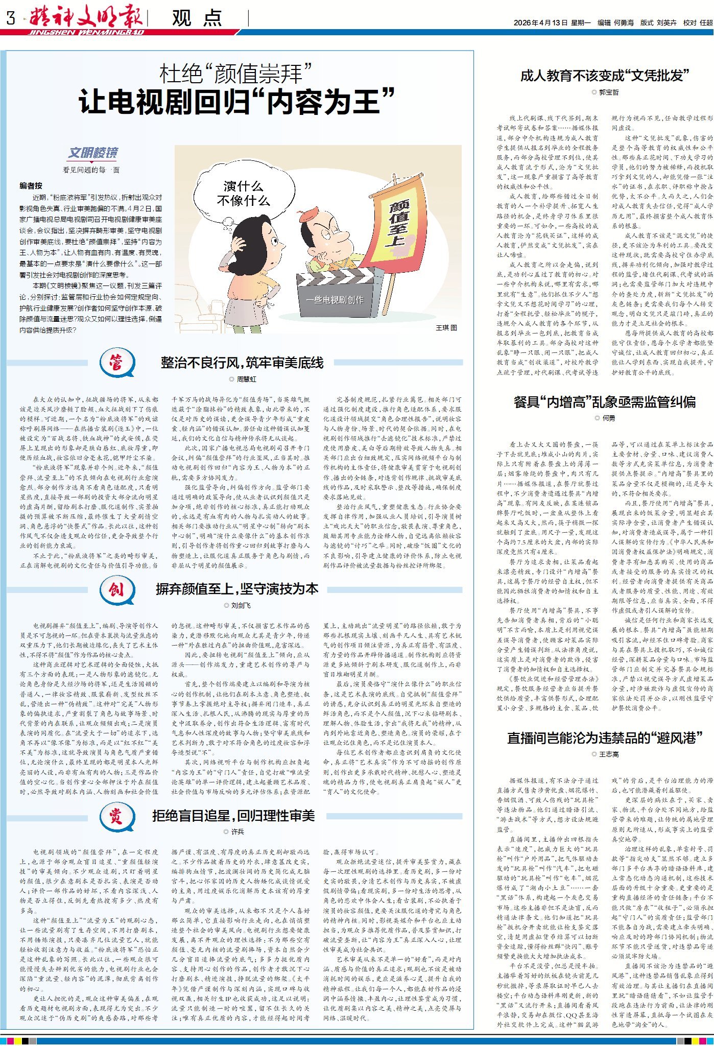 近期,“粉底液将军”引发热议,折射出观众对影视角色失真的普遍不满。4月2日,国家广播电视总局电视剧司召开电视剧健康审美座谈会,明确提出要杜绝“颜值崇拜”,坚持“内容为王、人物为本”,让人物有血有肉、有温度、有灵魂,“演什么要像什么”。今日3版《文明棱镜》栏目聚焦这一议题,探讨三个问题:监管层和行业协会如何定规定向、护航行业健康发展?创作者如何坚守创作本源、破除颜值与流量迷思?观众又如何以理性选择,倒逼内容供给提质升级?一起来看看。