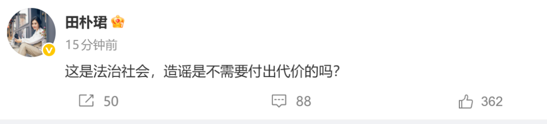 王石妻子田朴珺也发文辟谣,“这是法治社会,造谣是不需要付出代价的吗? ”