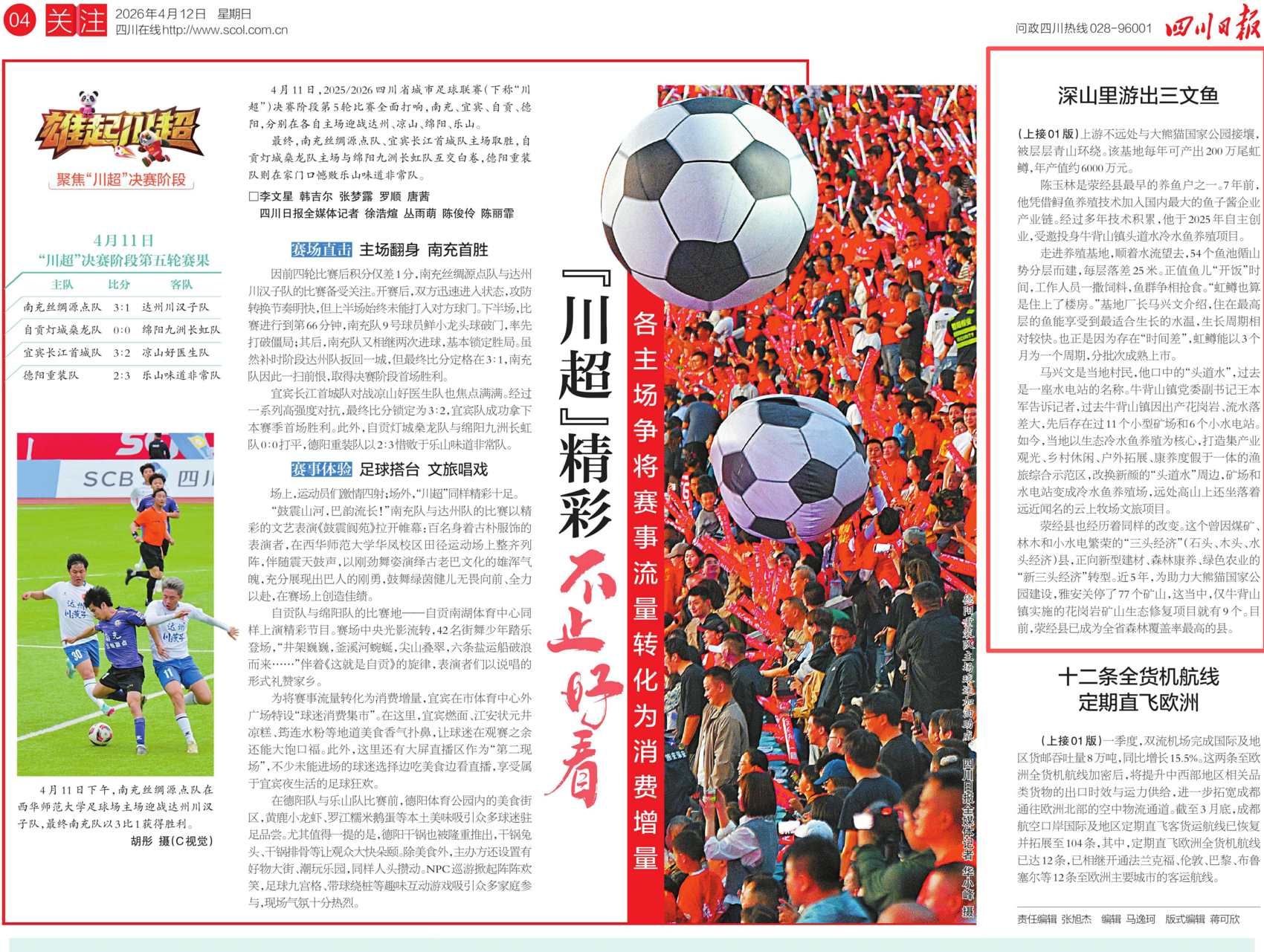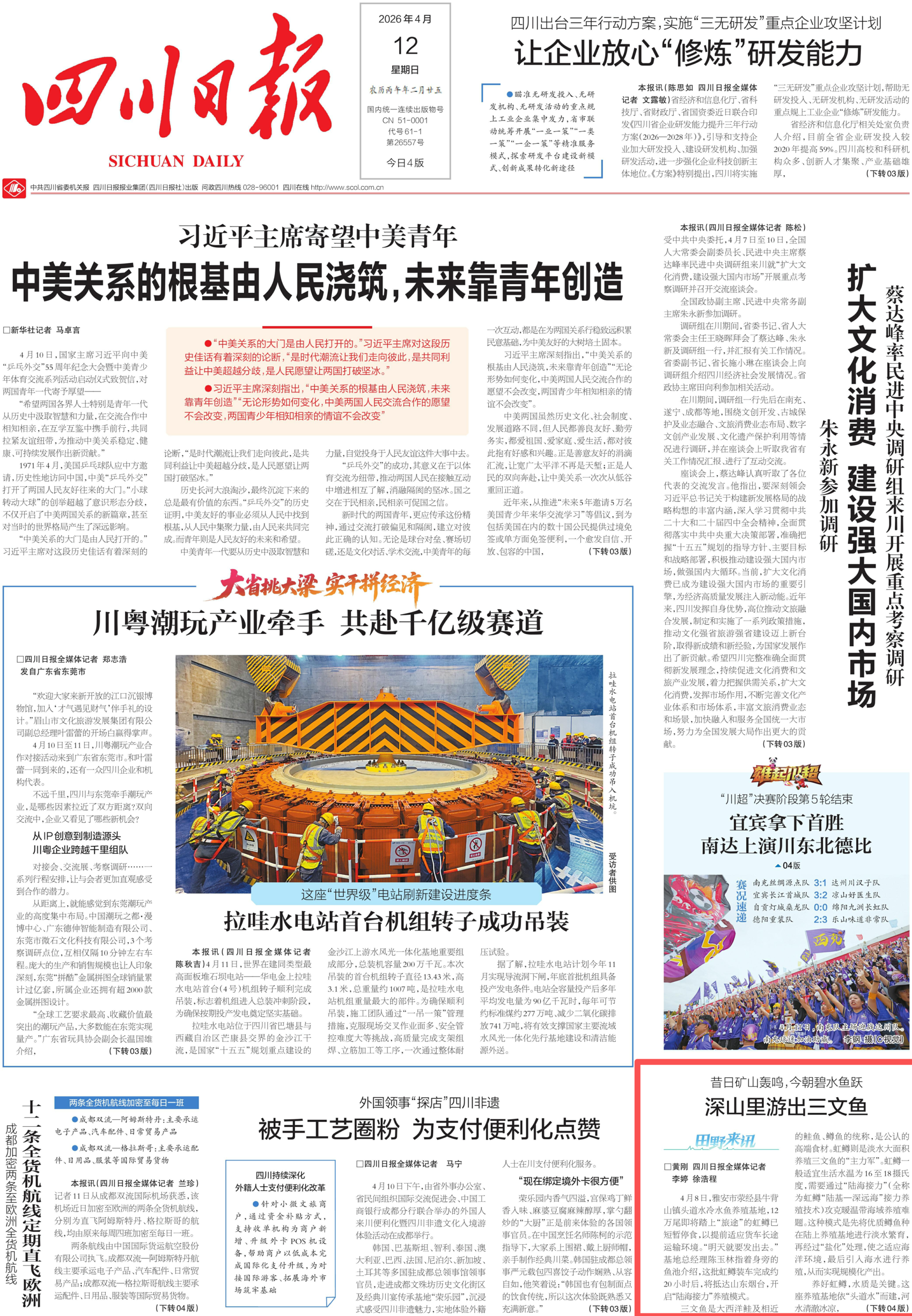 4月12日,四川日报1版、4版以“昔日矿山轰鸣,今朝碧水鱼跃——深山里游出三文鱼”为题,刊发报道。