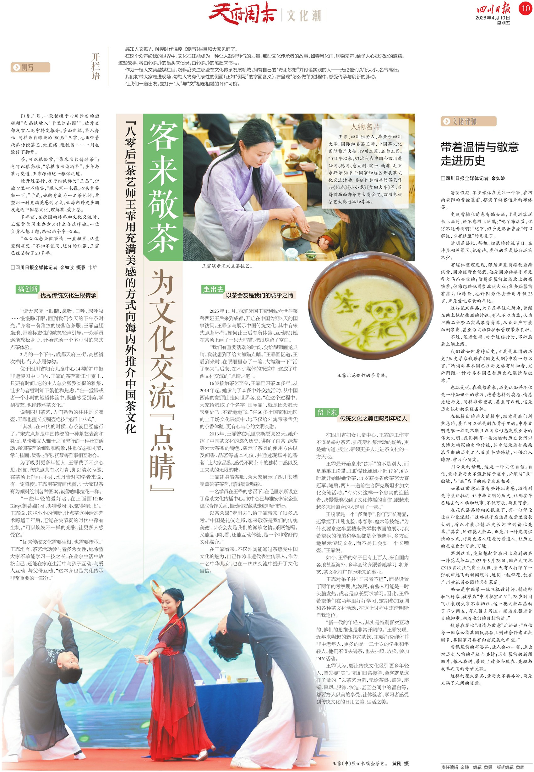 四川日报天府周末以《客来敬茶 为文化交流“点睛”》为题,专题讲述了雅安“八零后”茶艺师王霏用充满美感的方式向海内外推介中国茶文化的故事。