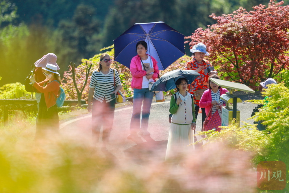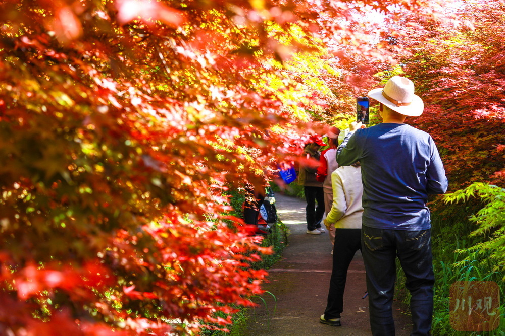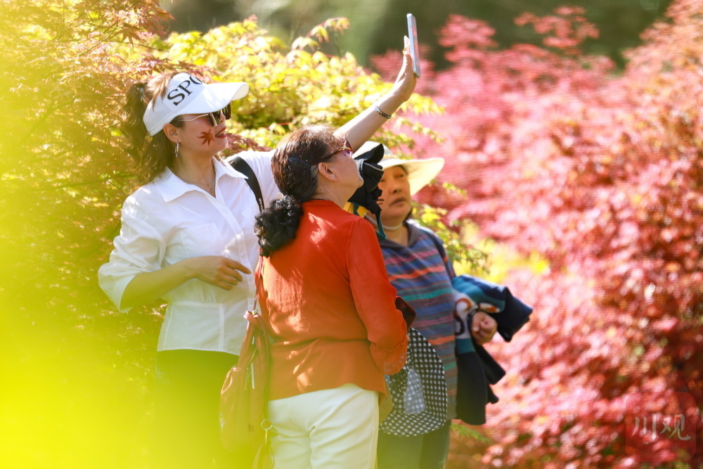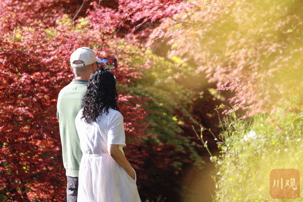 霜叶赤红确是真,春枫似火实撩人。4月11日,雅安市雨城区周公山镇金船山下,金船山·十里红枫内不同品种的枫叶争奇斗艳,或红似霞、或碧如玉,相互交融、斑斓炫目,成为芳菲四月一道靓丽的“枫”景线,引市民游客纷至沓来,或驻足观赏,或举起手机,定格下一个个美好的春日“枫”景。