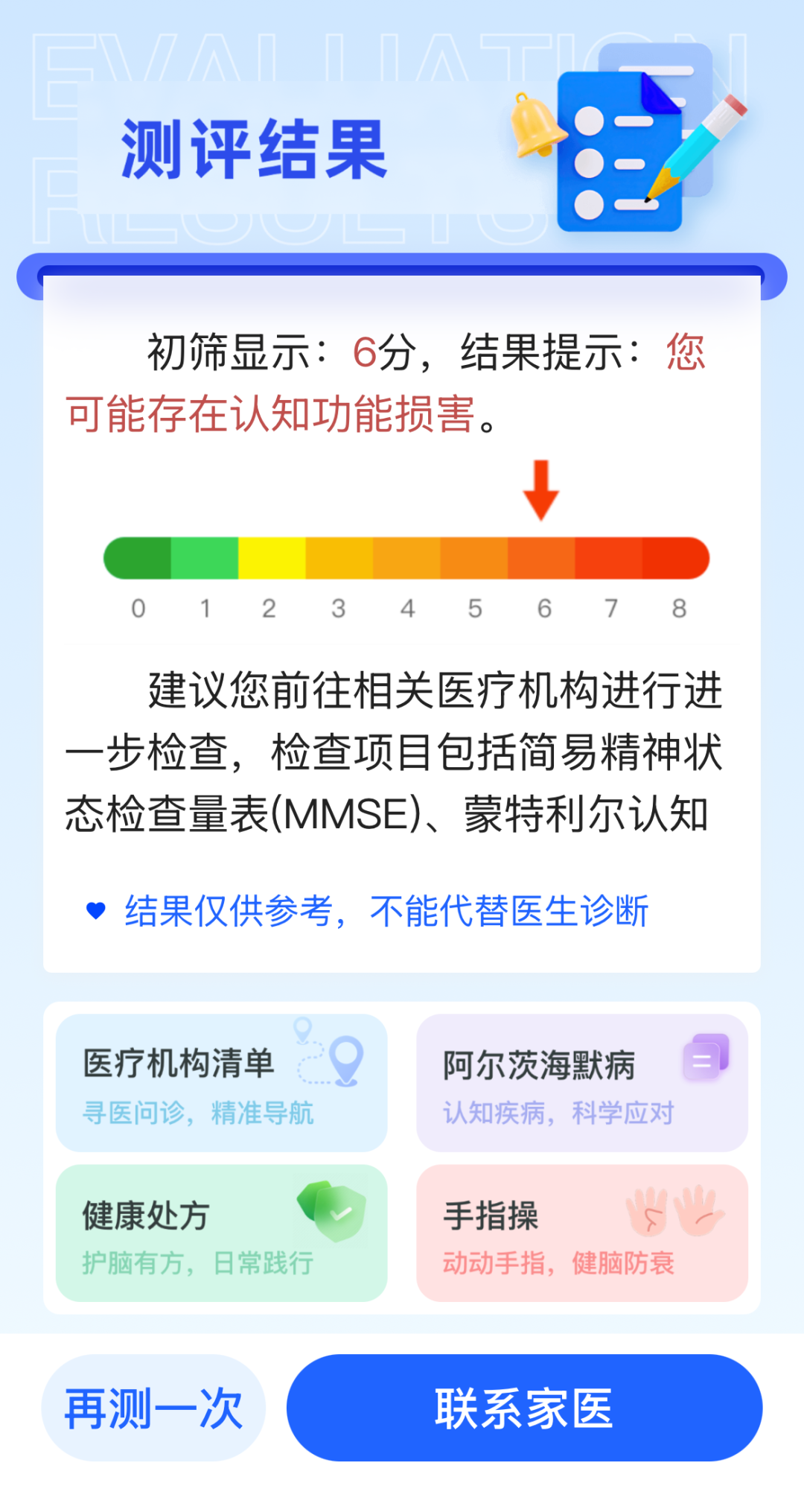测评结束即刻生成专属个性化健康指导处方,精准科普认知养护知识;同时支持一键直达专科预约服务,打通就医便民快车道,让智慧医疗服务更贴心、更高效、更暖心。