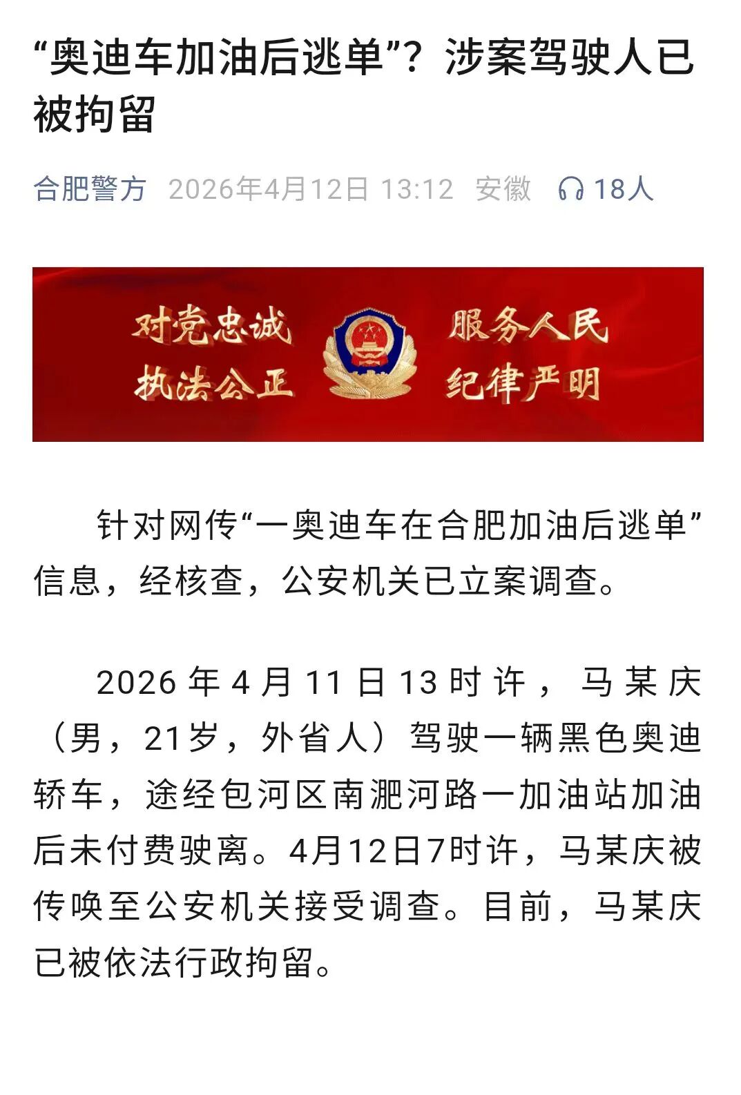 4月12日,合肥警方微信公众号发布《“奥迪车加油后逃单”?涉案驾驶人已被拘留》,全文如下: