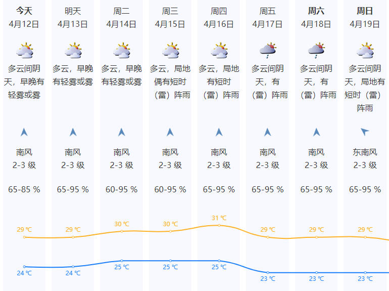 深圳天气预计,12-14日多云间阴天,午间较热,间中局地偶有短时(雷)阵雨,早晚有轻雾或雾;15-17日天气渐转不稳定,局地短时(雷)阵雨逐渐增多。