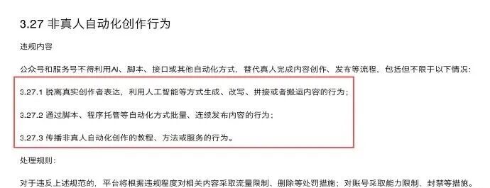 值得注意的是,微信公众号近日新增“非真人自动化创作行为”规则,明确规定:公众号和服务号不得利用AI、脚本、接口或其他自动化方式,替代真人完成内容创作、发布等流程。