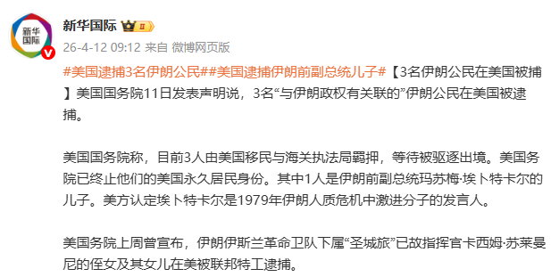 美国国务院11日发表声明说,3名“与伊朗政权有关联的”伊朗公民在美国被逮捕。