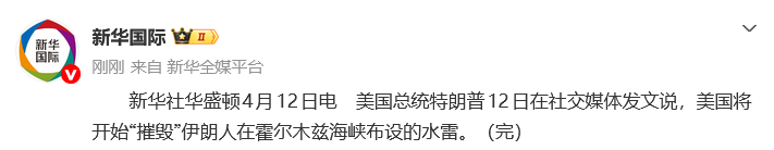 新华社华盛顿4月12日电美国总统特朗普12日在社交媒体发文说,美国将开始“摧毁”伊朗人在霍尔木兹海峡布设的水雷。