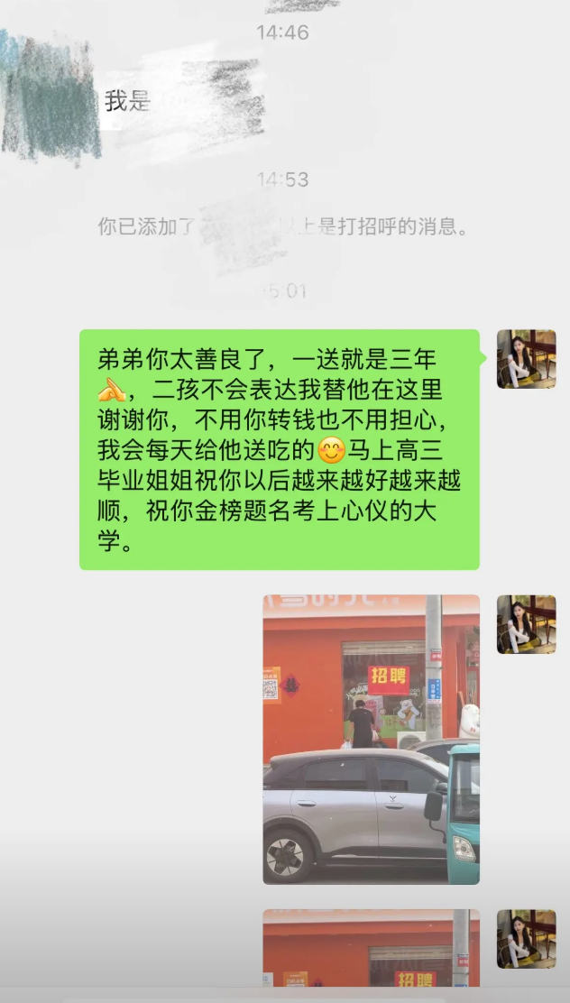 近日,山东潍坊,高三男生连续三年坚持给校门口有智力缺陷的老爷爷送吃的,临近毕业又拜托附近女摊主以后帮送:“我每天给你转个烤肠钱,麻烦你帮我送给那个老爷爷,我怕我毕业走了他会挨饿。”