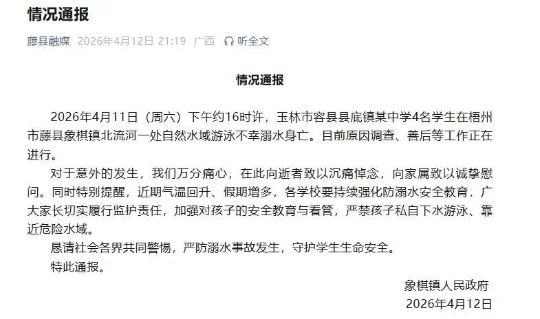 2026年4月11日(周六)下午约16时许,玉林市容县县底镇某中学4名学生在梧州市藤县象棋镇北流河一处自然水域游泳不幸溺水身亡。目前原因调查、善后等工作正在进行。