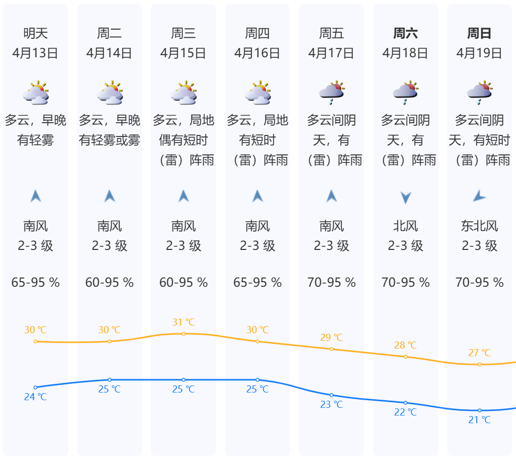 周一至周三(4月13日至15日),多云间阴天,早晚有轻雾或雾,间中局地偶有零星小雨,午间较热,13日气温24~30℃;