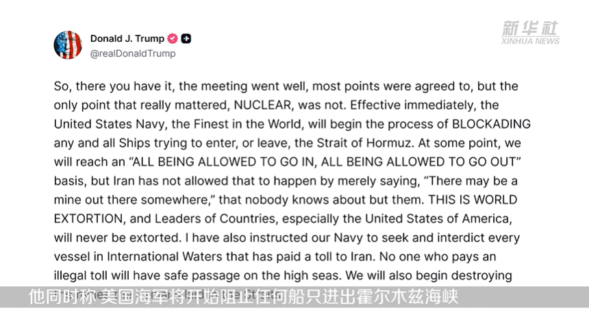 据此前报道,美国总统特朗普12日在社交媒体发文称,美伊谈判进展顺利,除核问题外,双方就大部分问题达成了一致。他同时称,美国海军将开始阻止任何船只进出霍尔木兹海峡。