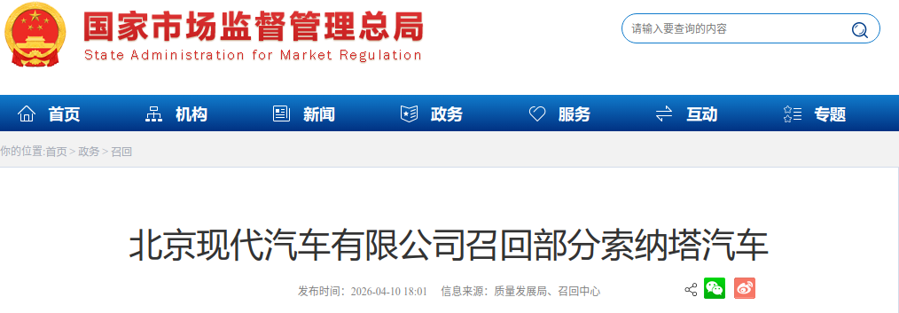 召回编号S2026M0042V:自2026年4月21日起,召回2025年9月1日至2025年10月13日期间生产的部分第十一代索纳塔汽车,共计953辆。