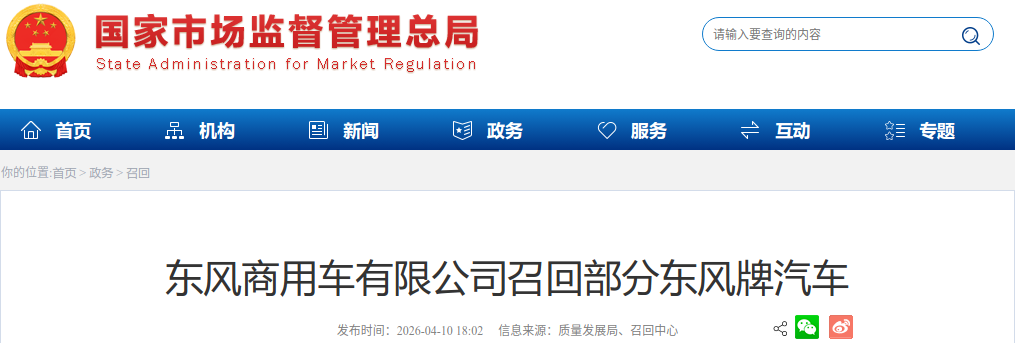 4月10日,国家市场监督管理总局网站发布信息,东风商用车有限公司、北京现代汽车有限公司日前根据《缺陷汽车产品召回管理条例》和《缺陷汽车产品召回管理条例实施办法》的要求,向国家市场监督管理总局备案了召回计划。