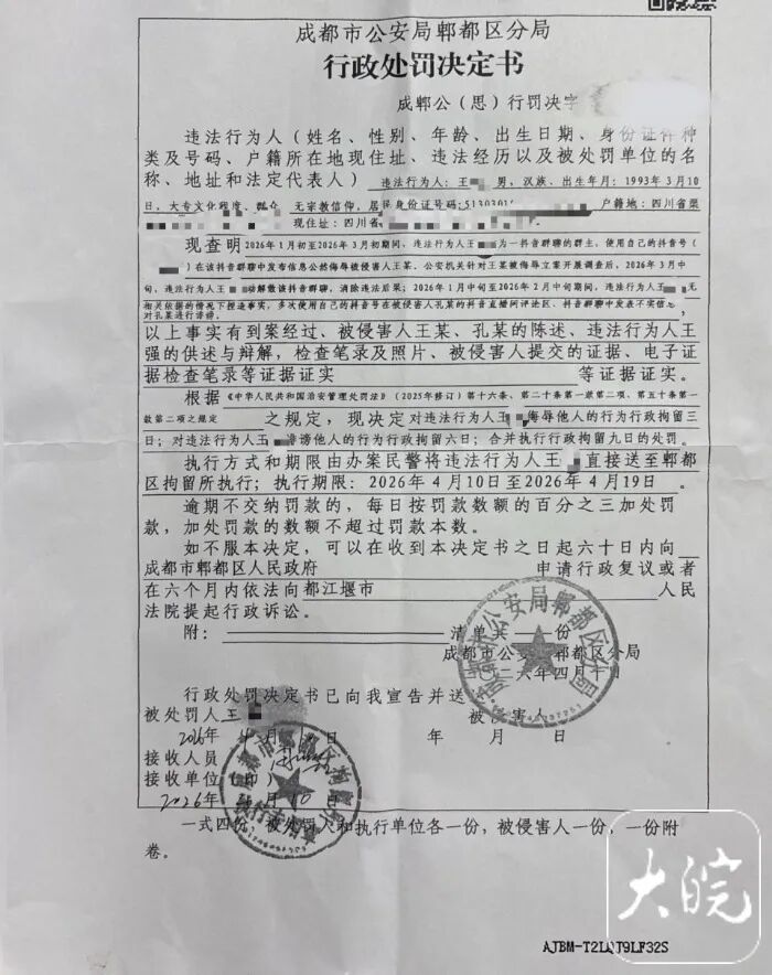 记者从成都市公安局郫都区分局作出的行政处罚决定书上看到,王某,成都人,1993年出生,大专文化。现查明,2026年1月至3月初,王某作为一抖音群主,在群聊中发布信息公然侮辱王颖;2026年1月至2月中旬,王某捏造事实,在孔明朗直播间评论区发表不实信息,进行诽谤。遂决定,对王某侮辱他人的行为行政拘留三日,对王某诽谤他人的行为行政拘留六日,合并执行行政拘留九日的行政处罚。
