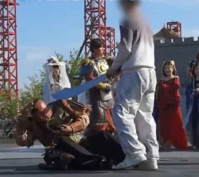 近日,河南开封清明上河园,一名饰演“金将军”的演员在与游客互动时,游客手中的道具“大刀”意外滑落,砸中演员头部致其流血受伤。