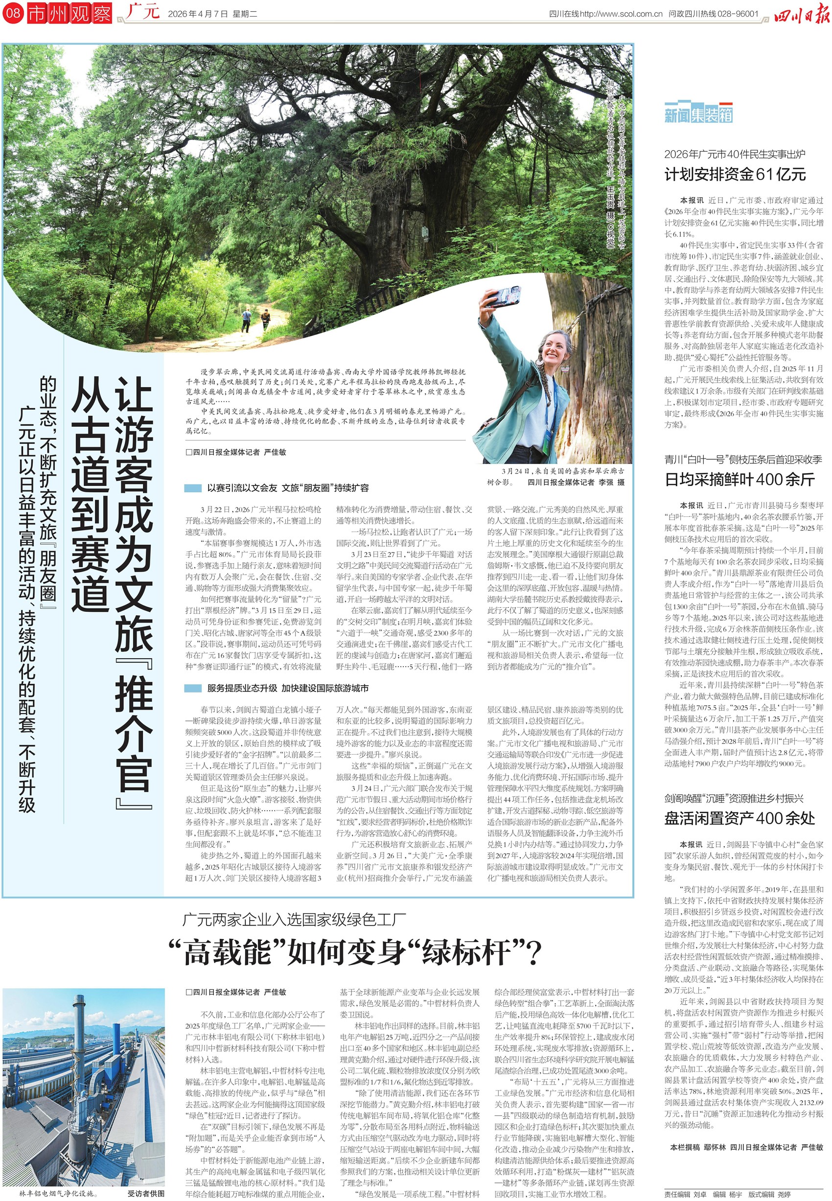 怎么办?清明假期过后,广元迅速进入深度“复盘时间”,并已明确改进“路线图”:加快引进品牌酒店、推动民宿集群提档升级,补齐古蜀道沿线配套短板;培育“蜀道乡土向导”人才,强化行业诚信与联合执法;培育夜间经济等新消费场景,推行联票与预约错峰制度;完善高峰客流应急预案,提升应急处置能力。从完善基础设施到培育新兴业态,从规范市场秩序到拓展国际市场,广元正努力将文旅产业从“资源依赖”推向“品质驱动”,让“一时火”真正变为“一直火”。