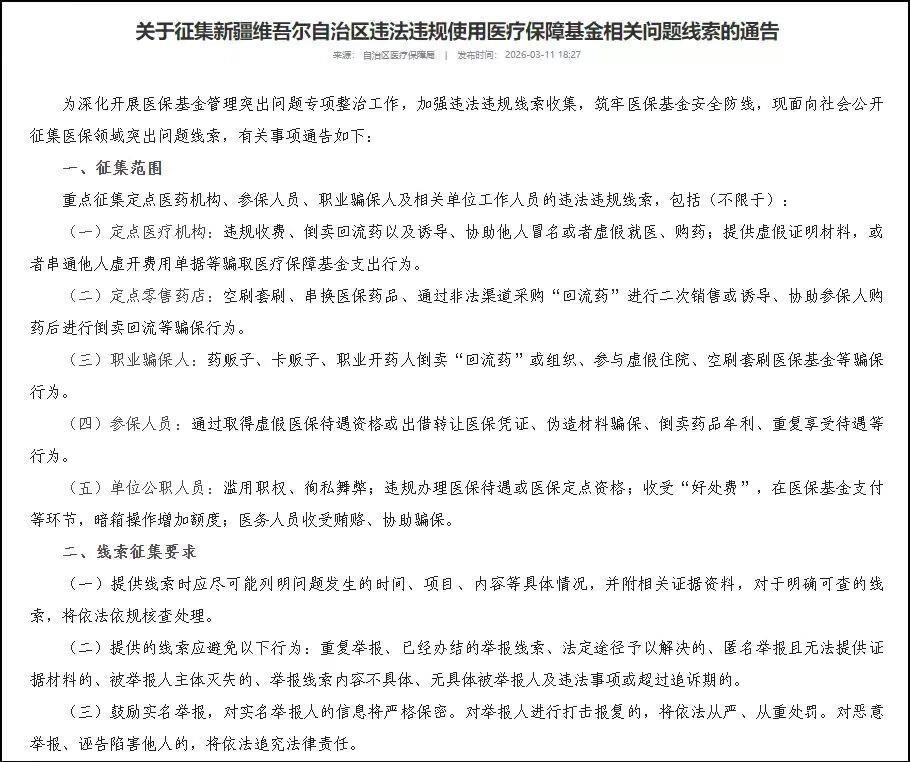 新疆维吾尔自治区医疗保障局关于征集问题线索的通告